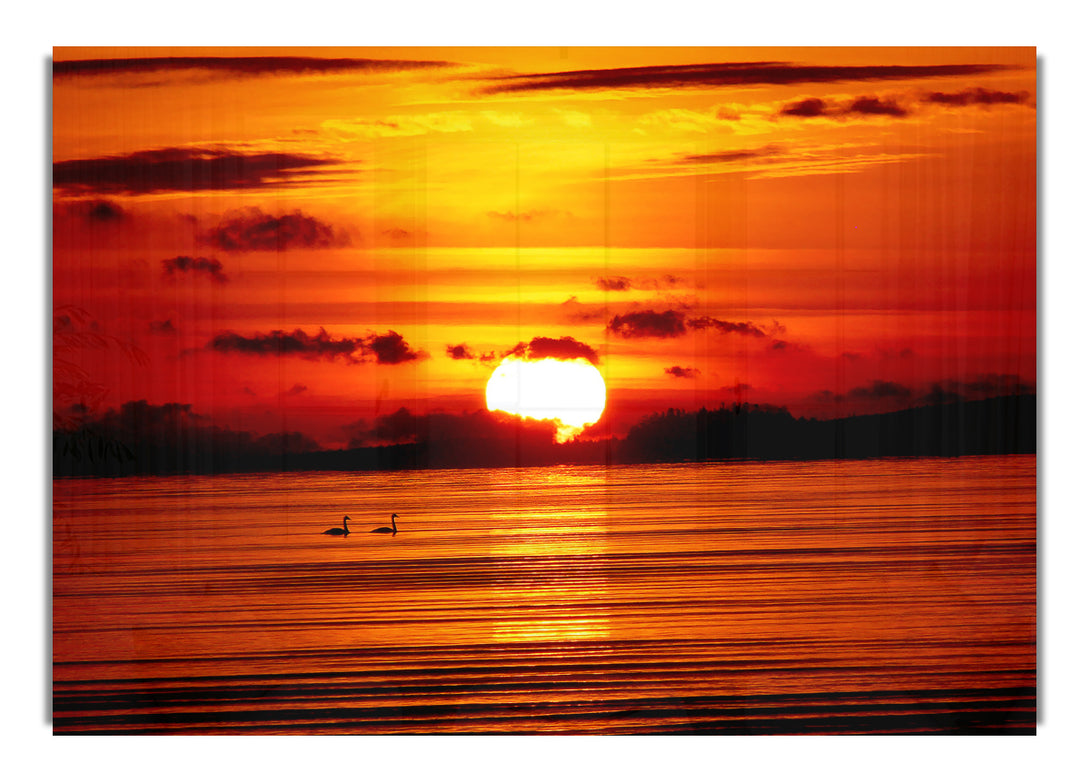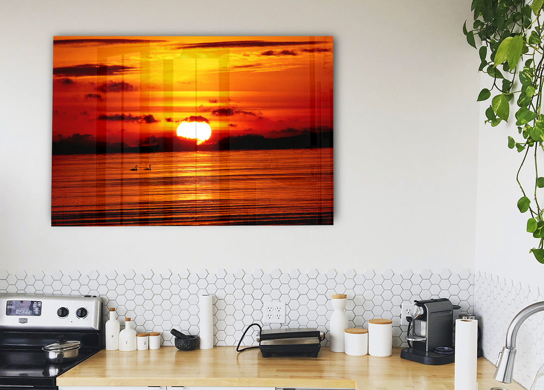 Acryldruck „Schwäne auf der orangefarbenen Meeresreflexion“, UV-Druck auf 5 mm dickes Acrylglas. Wird mit allem geliefert, was Sie zum Aufhängen an die Wand benötigen.
