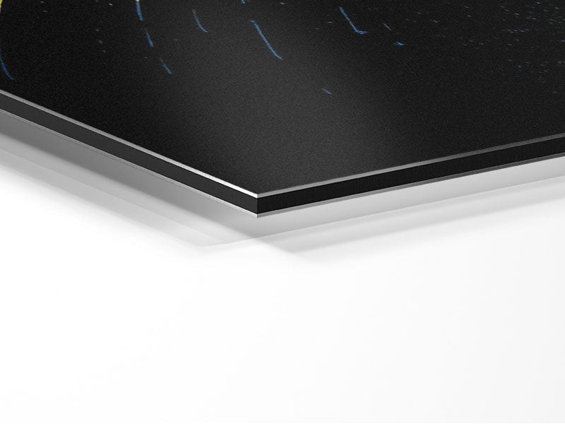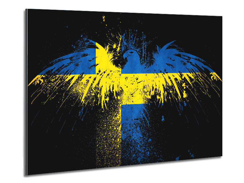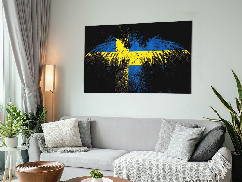 Schwedischer Flaggenadler, gedruckt auf gebürstetem Aluminium-Dibond. Eine moderne Art, Kunst zu präsentieren und leicht zu pflegen.