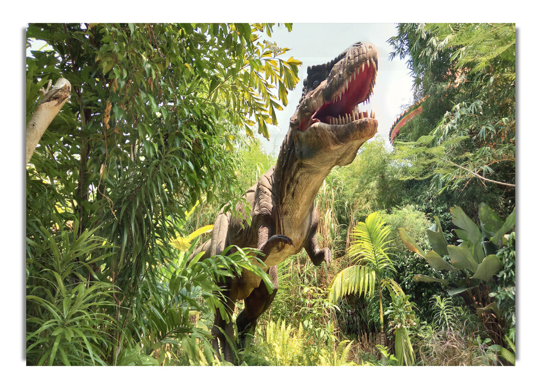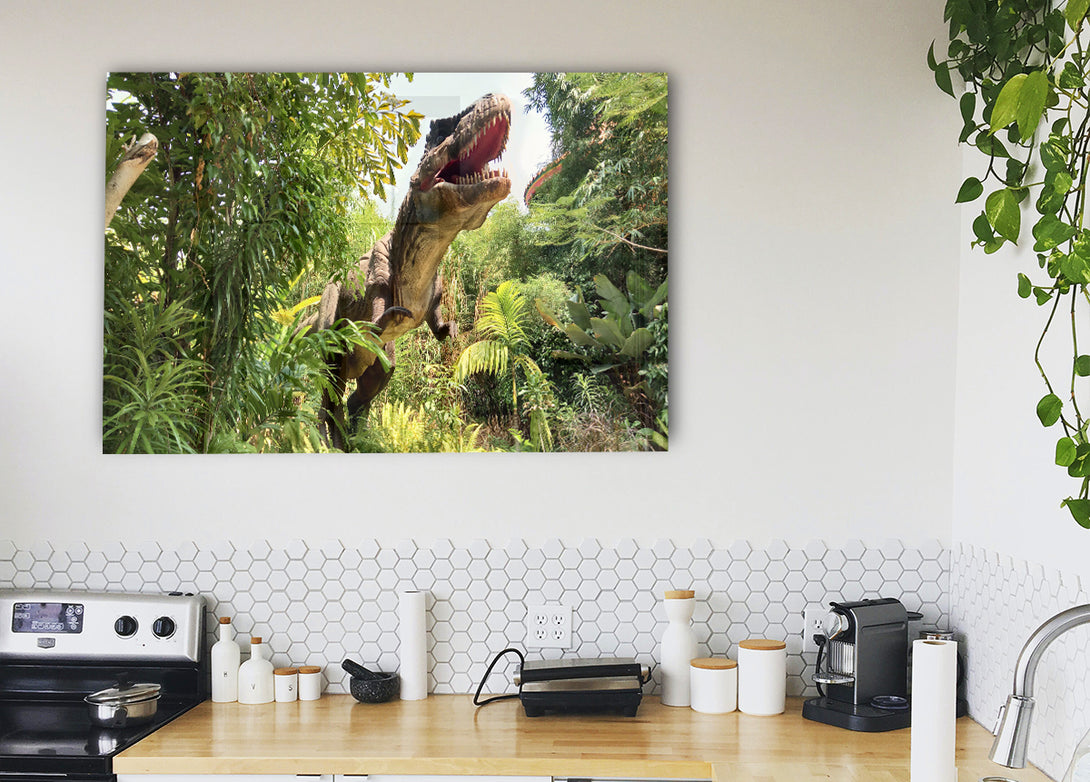 T-Rex Attack-Acryldruck, UV-gedruckt auf 5 mm dickes Acrylglas. Wird mit allem geliefert, was Sie zum Aufhängen an die Wand brauchen.