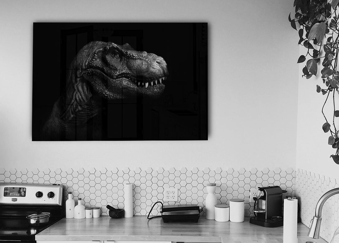 Acryldruck „T-Rex In The Dark“, UV-gedruckt auf 5 mm dickes Acrylglas. Wird mit allem geliefert, was Sie zum Aufhängen an die Wand brauchen.
