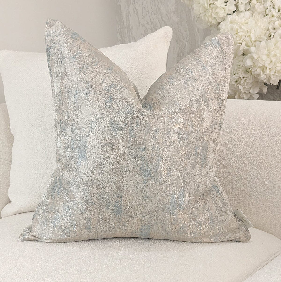 Elevate your interior with the Tamzin Gold & Duck Egg Metallic Cushion, a luxurious addition to your home decor.