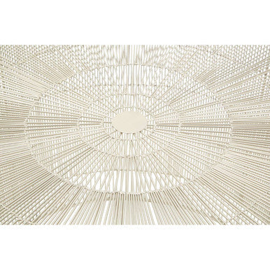 The iron strips that comprise its top section emerge from a central plate, with intersecting lines that produce a concentric circle pattern. Its sides follow a similar arrangement, combining to give the table a light and airy aesthetic.