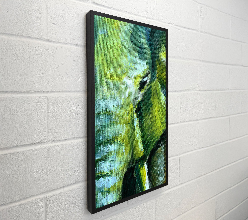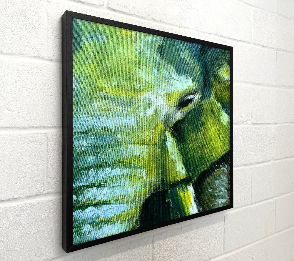 Quadratische Leinwand „Green Elephant“, gedruckt auf beschichteter Polyester-Leinwand. Auf einem 44 mm großen Kastenrahmen montiert, fertig zum Aufhängen.