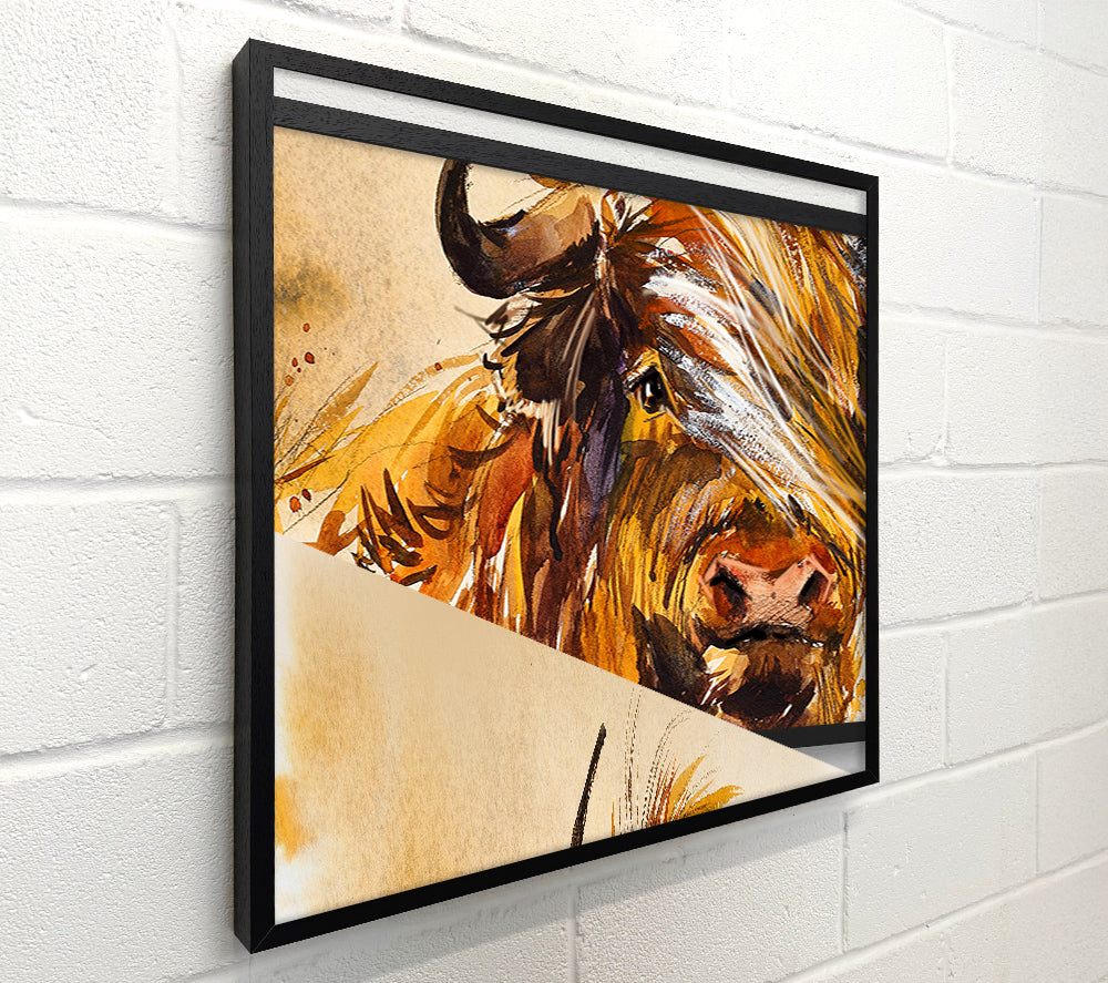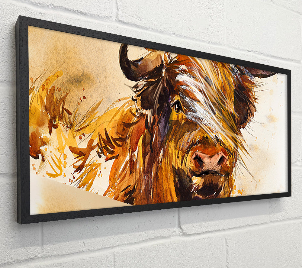 Die Highland Cow Illustration auf quadratischer Leinwand, gedruckt auf beschichteter Polyester-Leinwand. Auf einem 44 mm großen Kastenrahmen montiert, fertig zum Aufhängen.