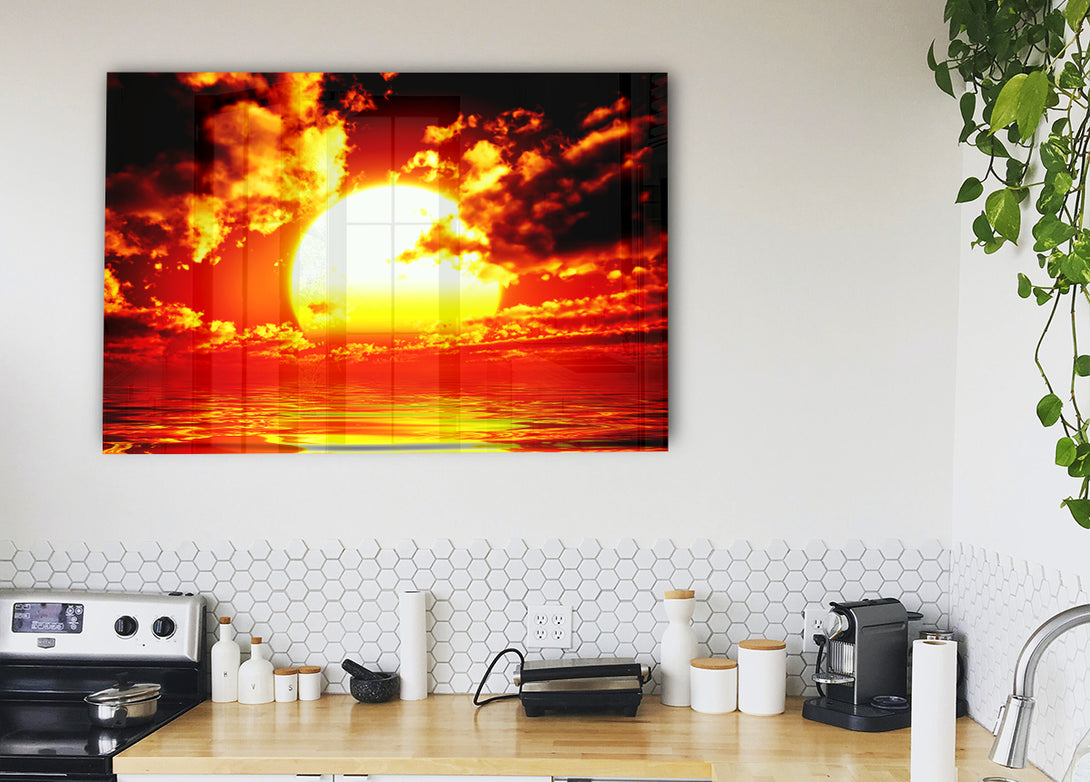 Der riesige Acryldruck „Sonne über dem Ozean“, UV-gedruckt auf 5 mm dickes Acrylglas. Wird mit allem geliefert, was Sie zum Aufhängen an Ihre Wand benötigen.