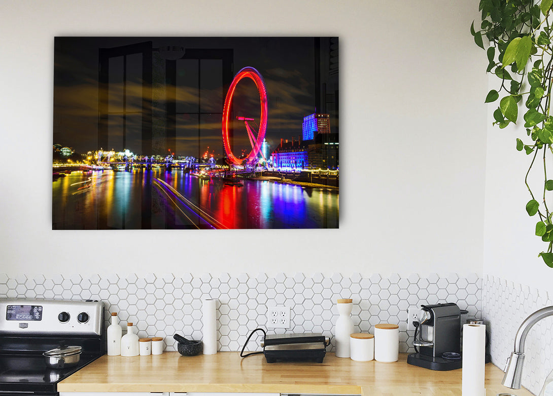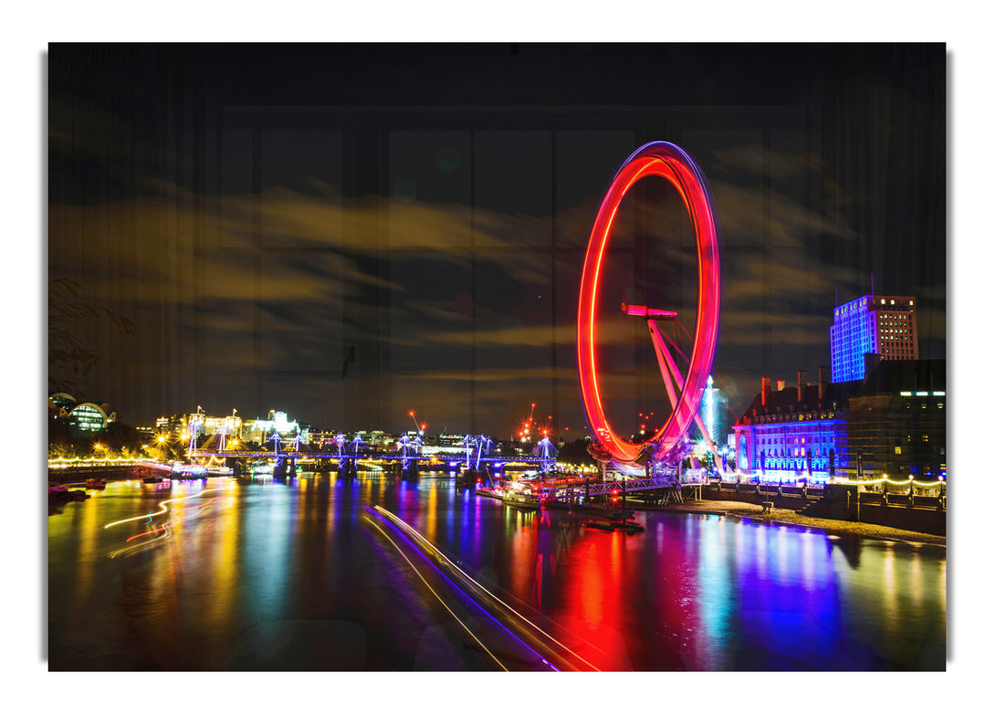 Acryldruck „London Eye Night“, UV-gedruckt auf 5 mm dickes Acrylglas. Wird mit allem geliefert, was Sie zum Aufhängen an die Wand brauchen.