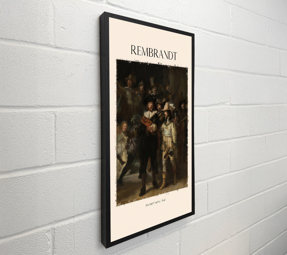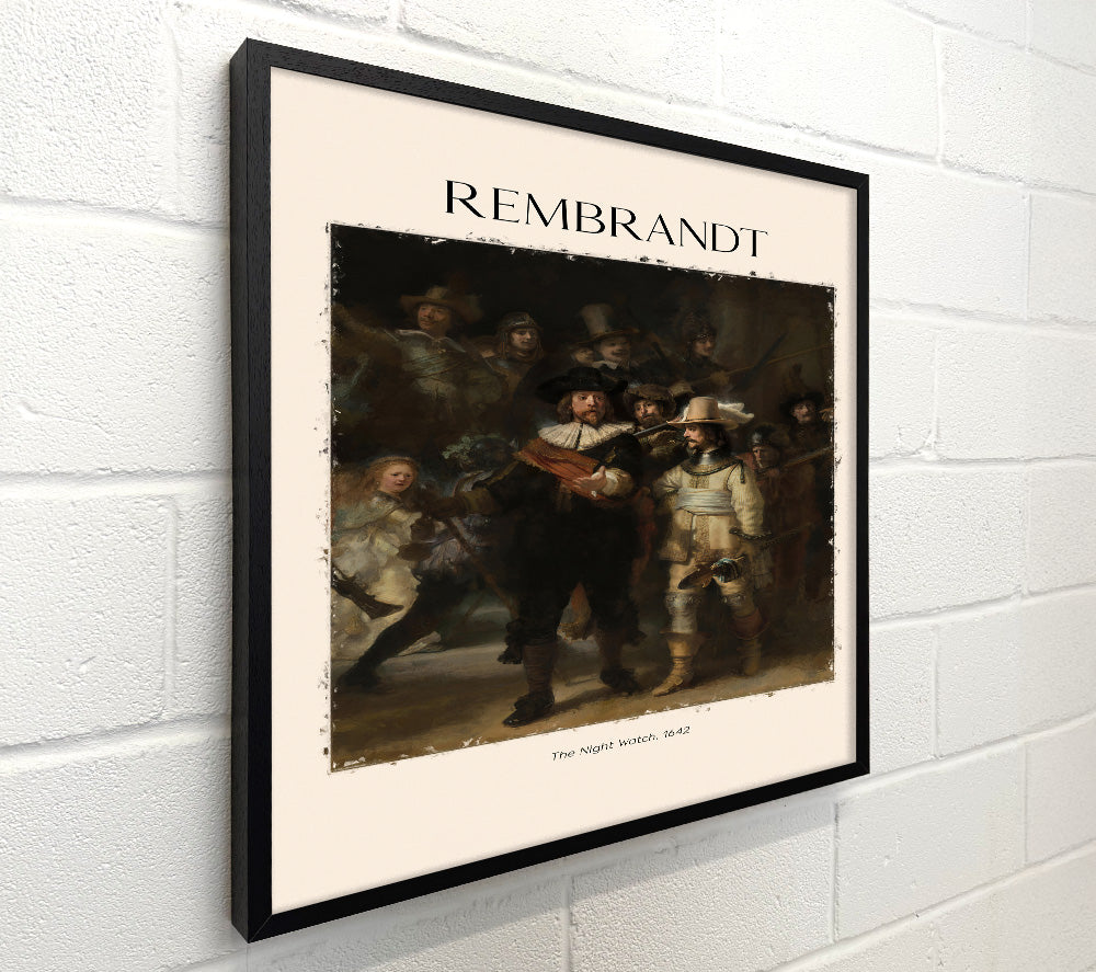 Die Nachtwache, 1642, von Rembrandt. Quadratische Leinwand, gedruckt auf beschichteter Polyester-Leinwand. Auf einem 44 mm großen Rahmen montiert, fertig zum Aufhängen.