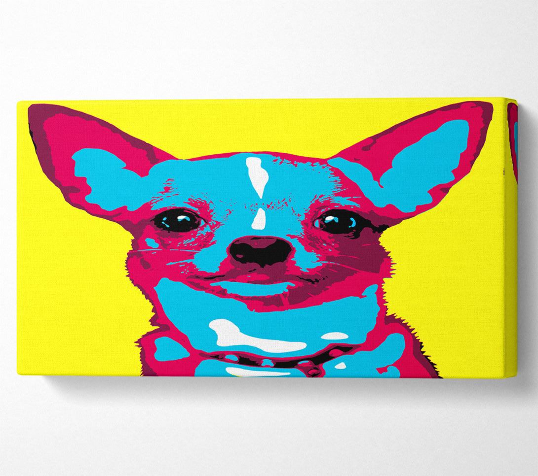Die Pop-Art-Chihuahua-Leinwand ist breit und auf beschichtetem Polyester-Canvas gedruckt. Auf einem 44 mm großen Rahmen montiert, fertig zum Aufhängen.