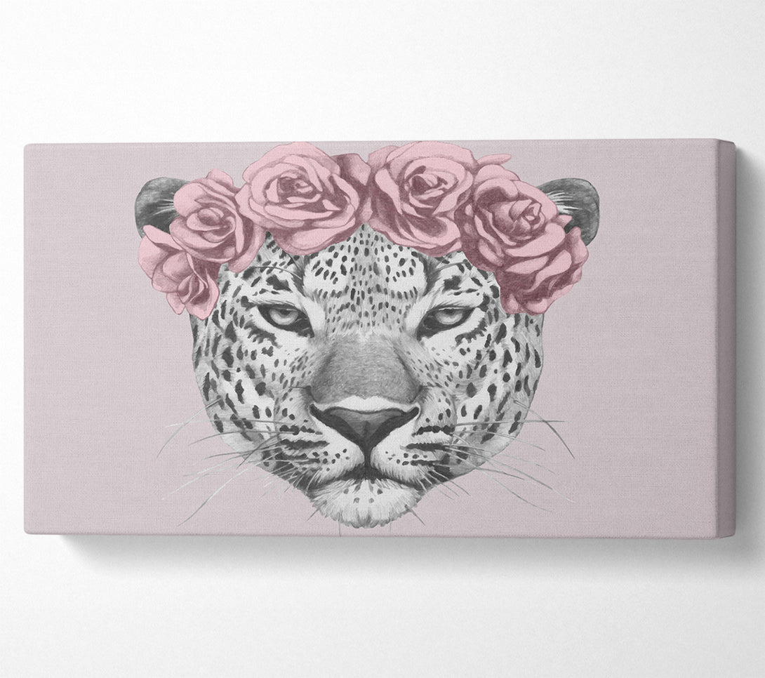 Breite Leinwand mit dem Rosenkopf-Leopardenmotiv, gedruckt auf beschichteter Polyester-Leinwand. Auf einem 44 mm breiten Kastenrahmen montiert, fertig zum Aufhängen.