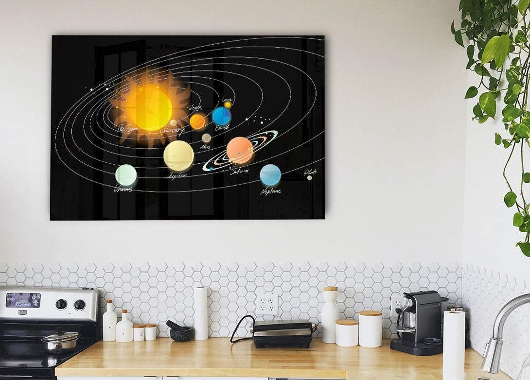 Acryldruck „Sonnensystem 1“, UV-gedruckt auf 5 mm dickes Acrylglas. Wird mit allem geliefert, was Sie zum Aufhängen an die Wand brauchen.