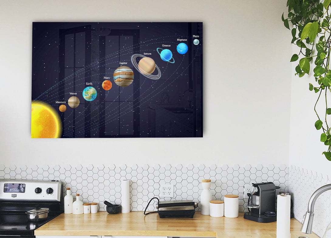 Acryldruck „Sonnensystem 3“, UV-gedruckt auf 5 mm dickes Acrylglas. Wird mit allem geliefert, was Sie zum Aufhängen an die Wand brauchen.