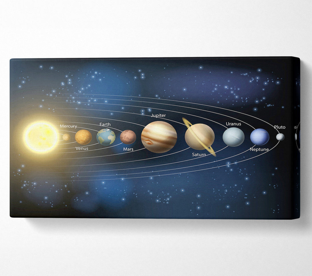 Das Sonnensystem 4, breite Leinwand, gedruckt auf beschichteter Polyester-Leinwand. Auf einem 44 mm breiten Kastenrahmen montiert, fertig zum Aufhängen.