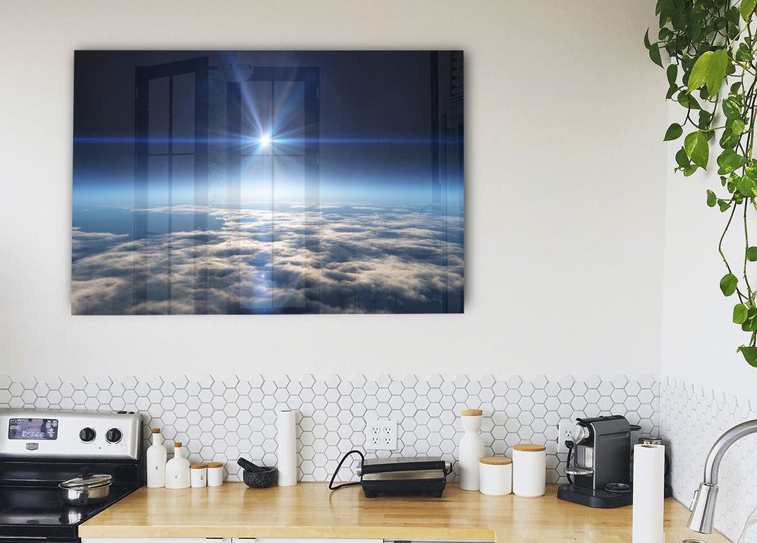 Die Sonne über den Wolken und Atmosphäre auf Acrylglas, UV-gedruckt auf 5 mm dickes Acrylglas. Wird mit allem geliefert, was Sie zum Aufhängen an Ihre Wand benötigen.