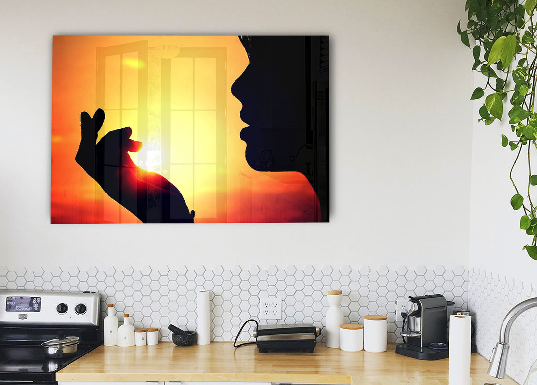 Acryldruck „The Sun In Her Palm“, UV-gedruckt auf 5 mm dickes Acrylglas. Wird mit allem geliefert, was Sie zum Aufhängen an Ihre Wand benötigen.