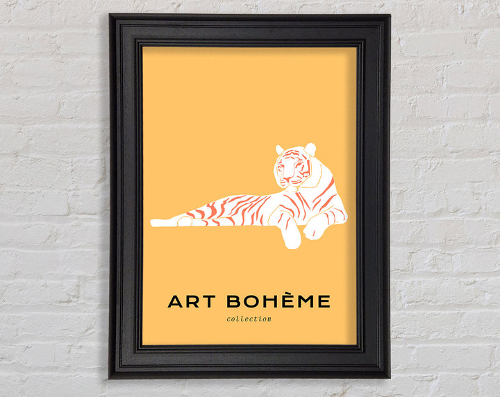Der gerahmte Druck „Der weiße Tiger auf Gelb“, erhältlich in mehreren Rahmenfarben. Fertig zum Aufhängen aus der Schachtel und handgefertigt im Vereinigten Königreich.