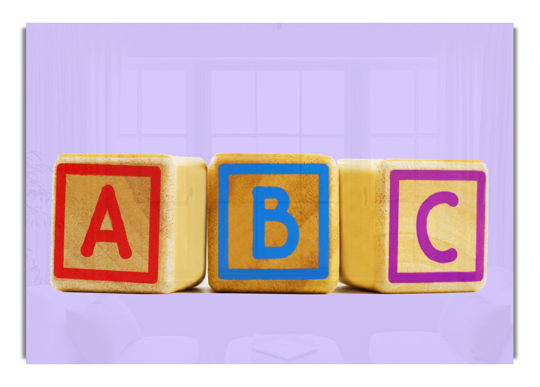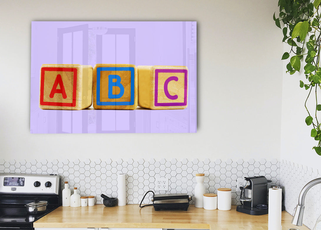 Lila Acryldruck mit drei Alphabetblöcken, UV-gedruckt auf 5 mm dickes Acrylglas. Wird mit allem geliefert, was Sie zum Aufhängen an die Wand brauchen.