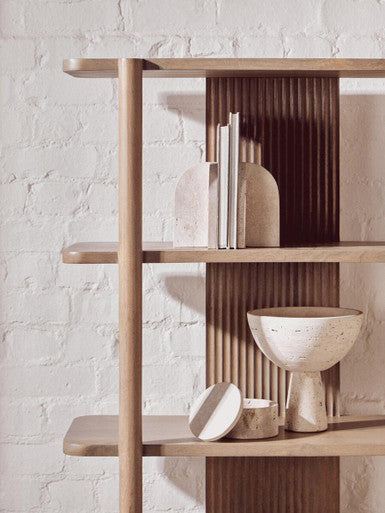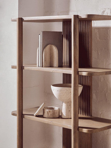 The Tibor pedestal bowl features a tapered base and a timeless travertine finish in shades of white, tan, cream, and rust varieties.