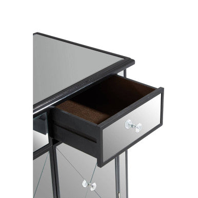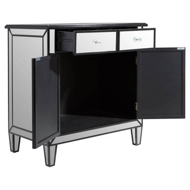 It boasts a pair of large cupboards, with two drawers above adding to the storage space. The cut glass handles contribute to the glamorous aesthetic. Coordinate it with the Tiffany console table.