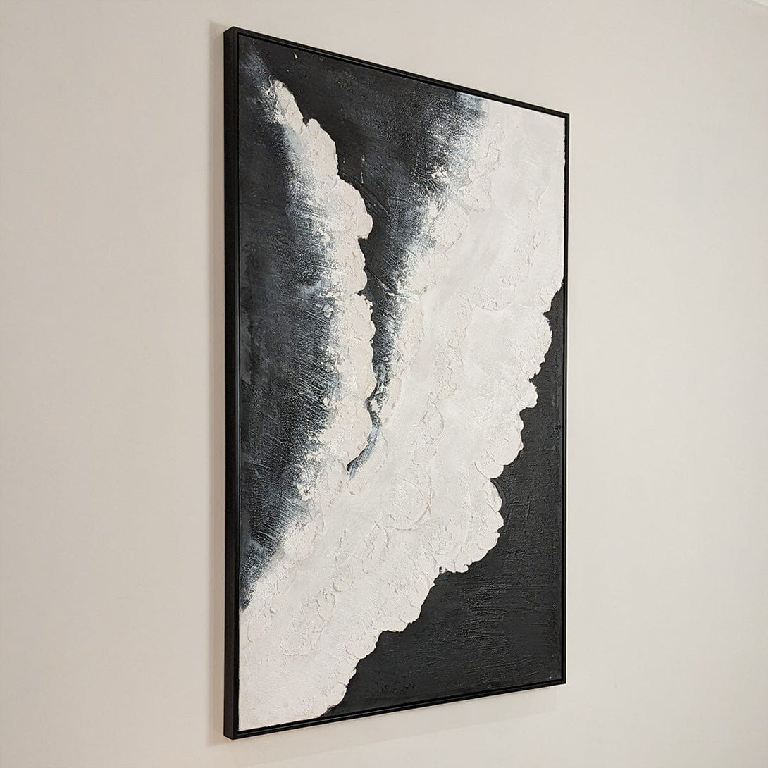This stunning piece captures the serene beauty of beach waves in a striking black and white palette.
