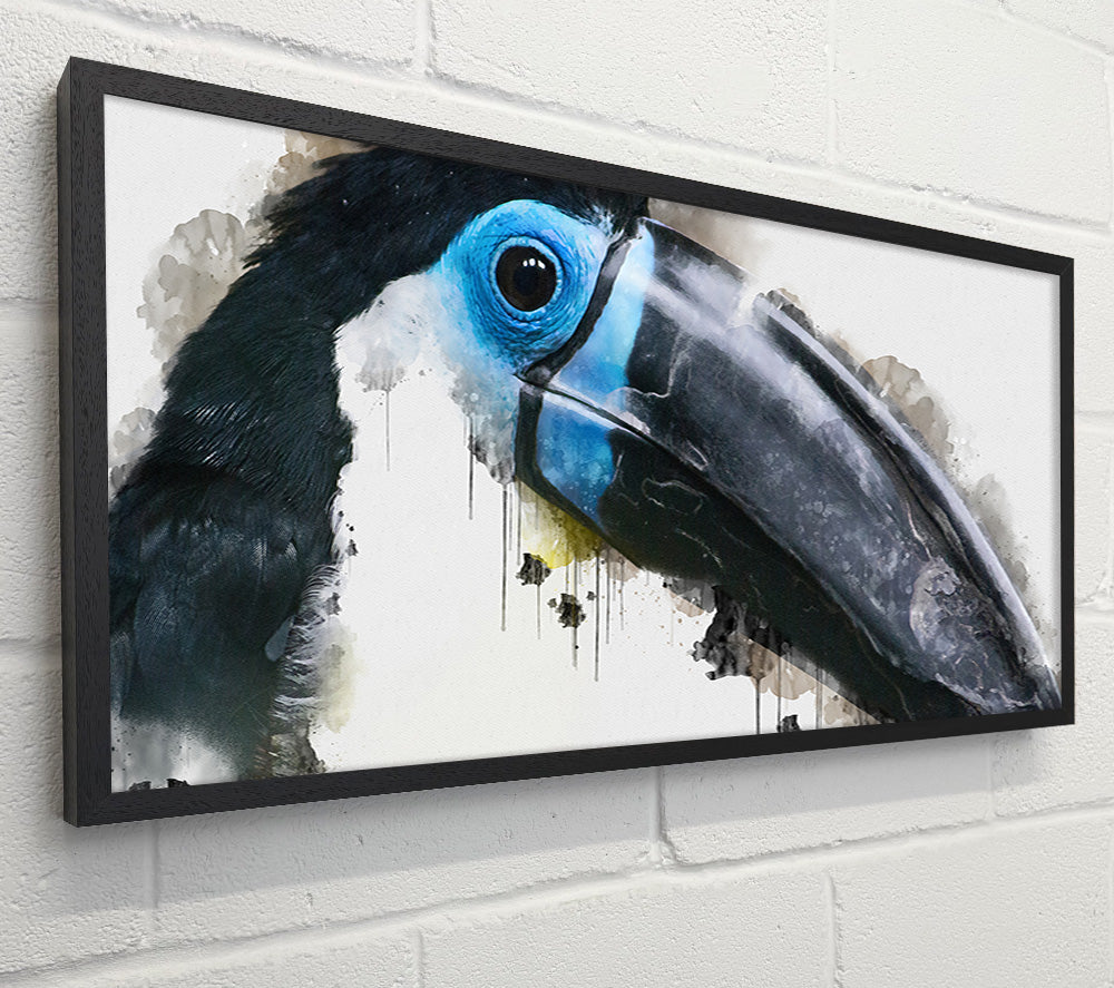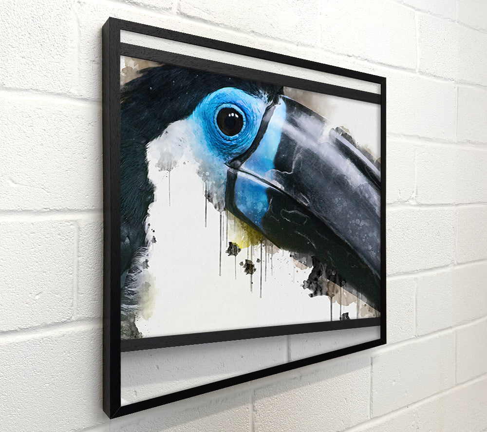 Quadratische Leinwand mit Tukan-Aquarell, gedruckt auf beschichteter Polyester-Leinwand. Auf einem 44 mm großen Kastenrahmen montiert, fertig zum Aufhängen.