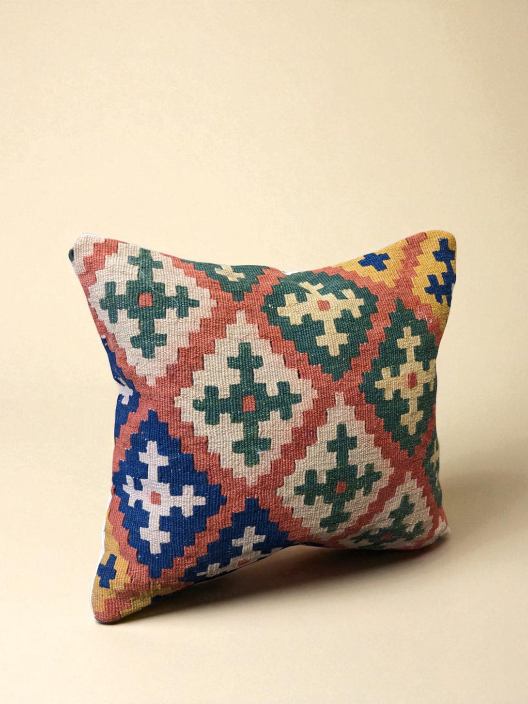 Our Bobliss cushion is a modern, hand-woven work of art from vintage Turkish kilim! Its transitional geometric pattern is perfect for adding a colourful flourish to any living room, bedroom, or kids room, this 42cm x 40cm flatweave is crafted with wool for quality and longevity so you can enjoy it for years to come.