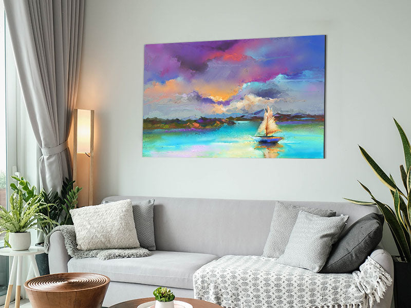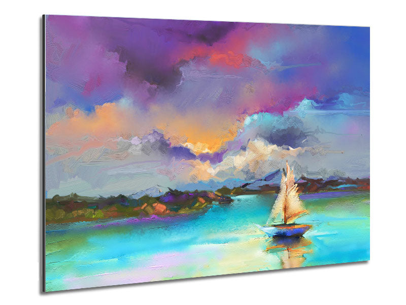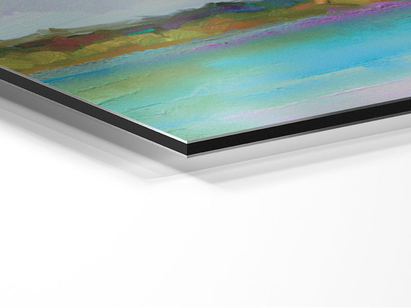 Türkisfarbener Bootssee. Gedruckt auf gebürstetem Aluminium-Dibond. Eine moderne Art, Kunst zu präsentieren und leicht zu pflegen.