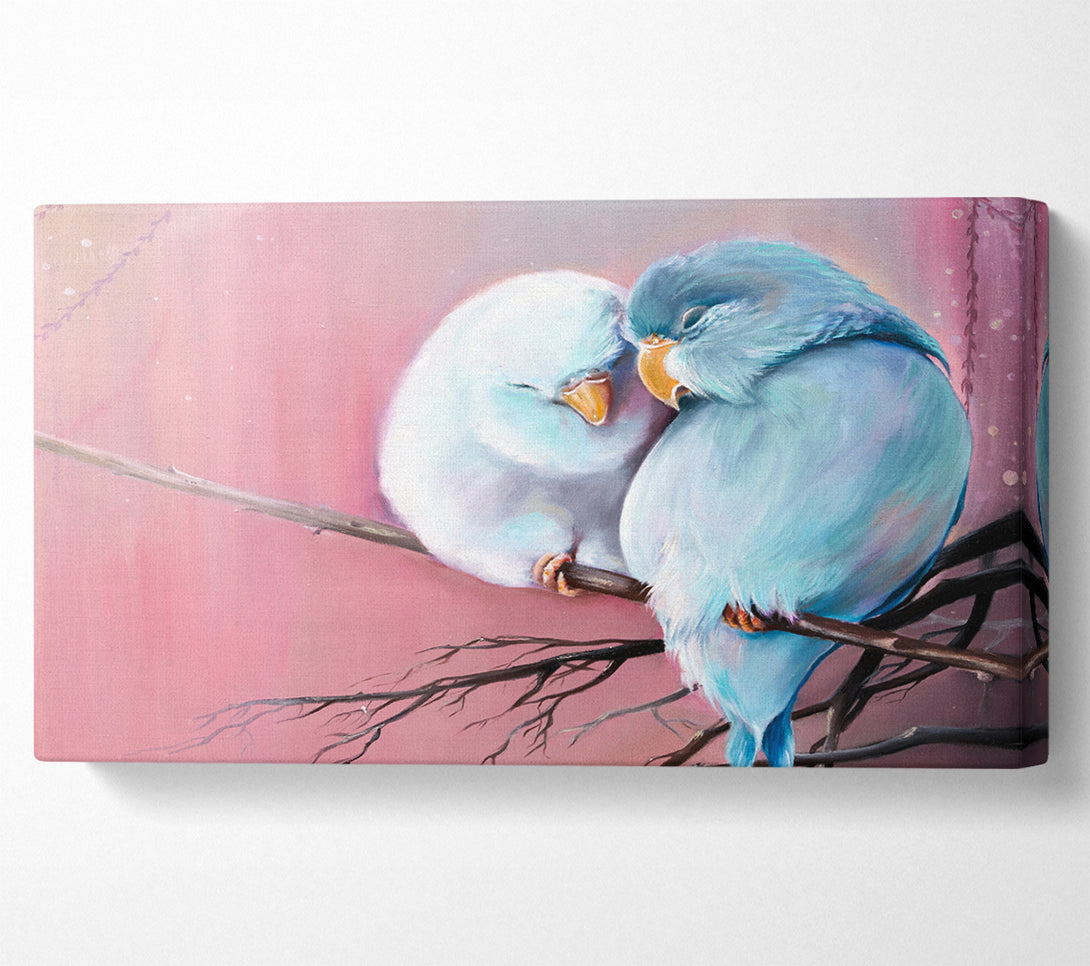 Breite Leinwand mit dem Motiv „Zwei Turteltauben auf einem Ast“, gedruckt auf beschichteter Polyester-Leinwand. Auf einem 44 mm breiten Kastenrahmen montiert, fertig zum Aufhängen.