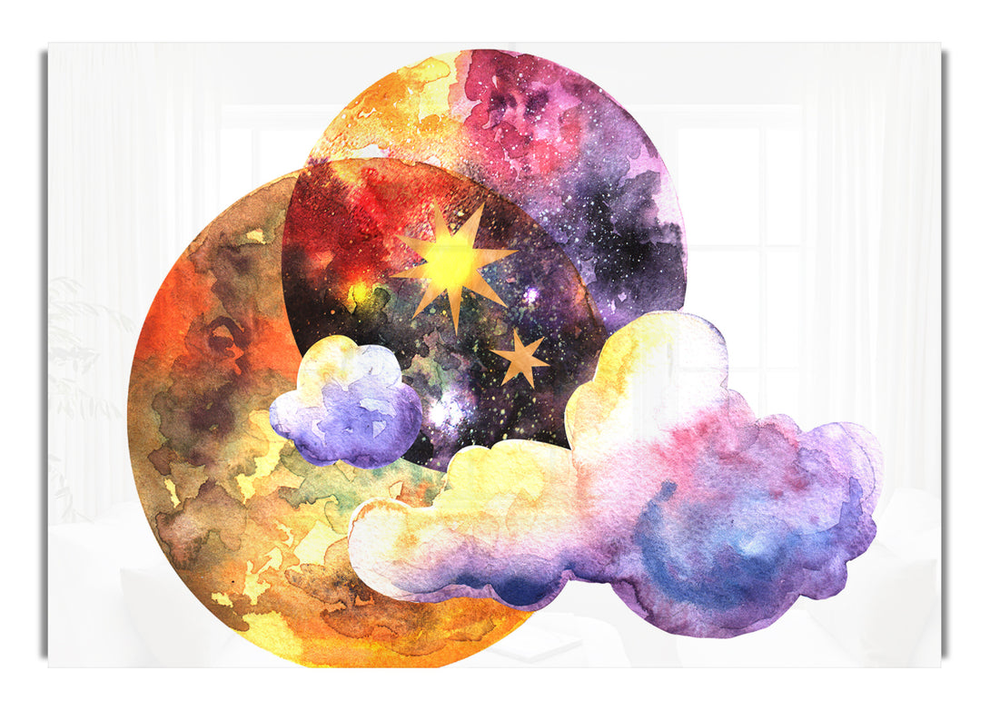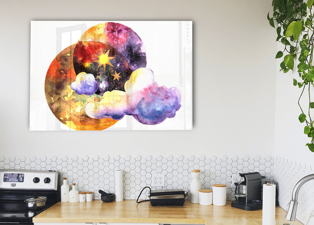Acryldruck „Zwei Monde und Wolken“, UV-Druck auf 5 mm dickes Acrylglas. Wird mit allem geliefert, was Sie zum Aufhängen an die Wand brauchen.