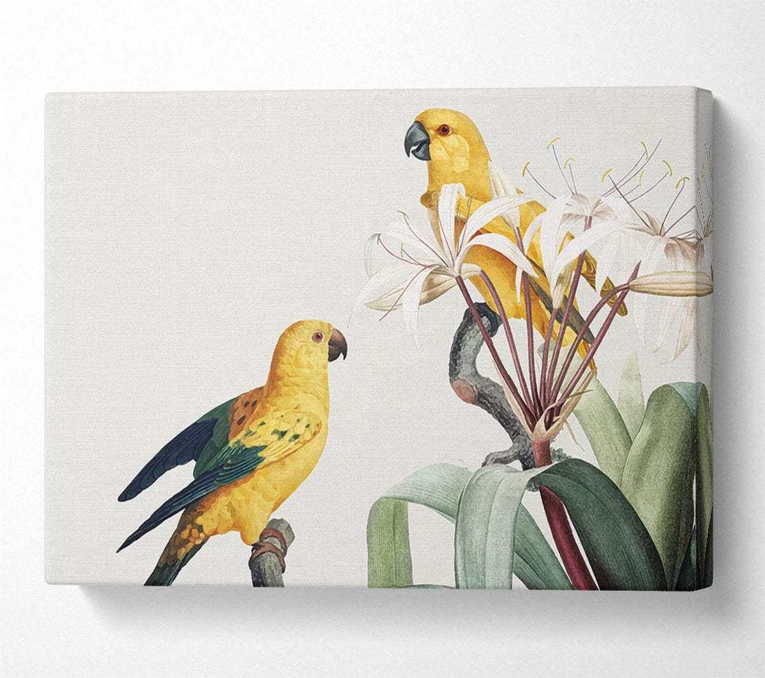 Leinwandbild „Zwei gelbe Papageien“, gedruckt auf beschichteter Polyester-Leinwand. Auf einem 44 mm großen Kastenrahmen montiert, fertig zum Aufhängen.
