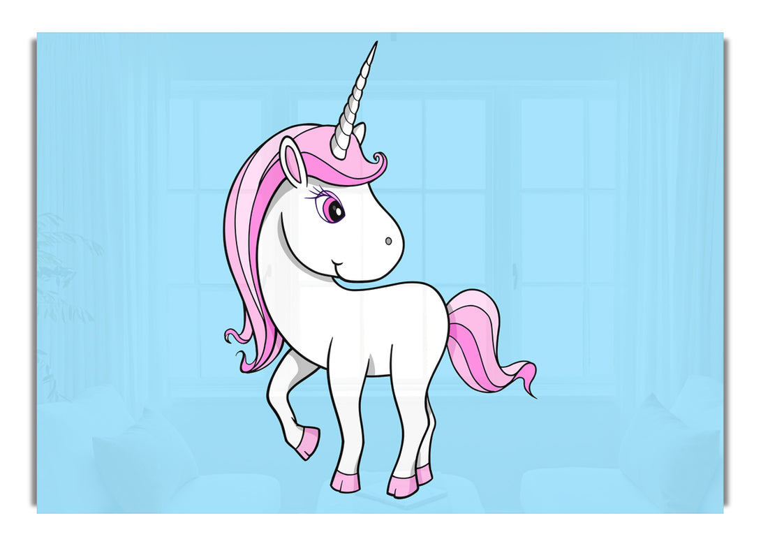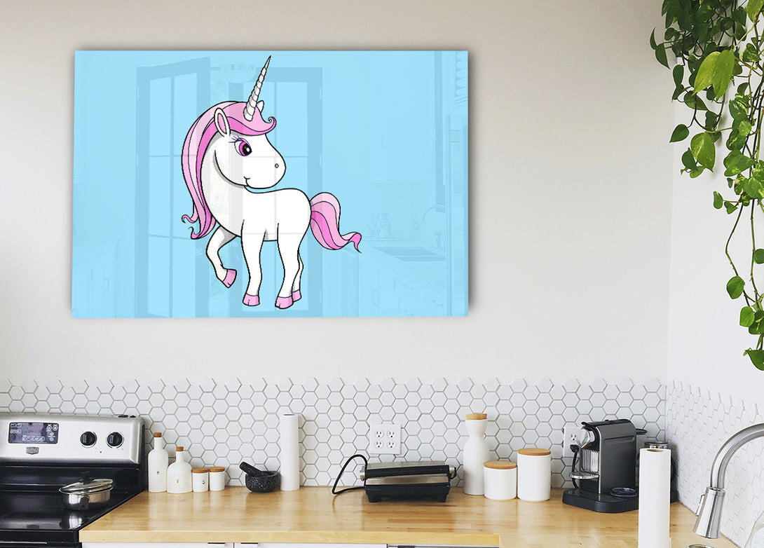 Acryldruck „Unicorn Walking Baby Blue“, UV-gedruckt auf 5 mm dickes Acrylglas. Wird mit allem geliefert, was Sie zum Aufhängen an die Wand brauchen.