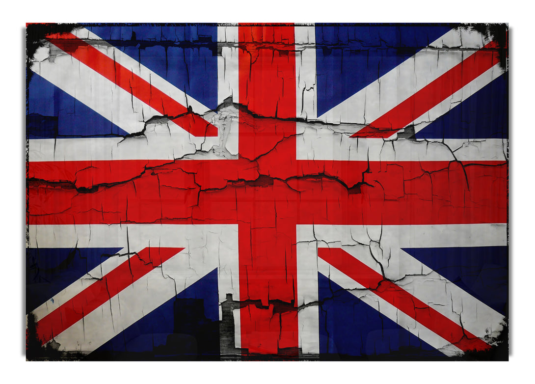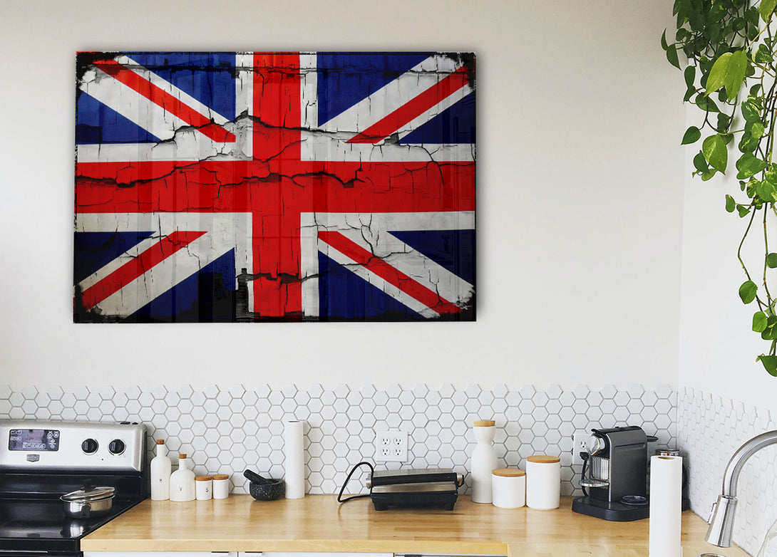 Gebrochener Acryldruck mit Flagge des Vereinigten Königreichs, UV-Druck auf 5 mm dickes Acrylglas. Wird mit allem geliefert, was Sie zum Aufhängen an die Wand benötigen.
