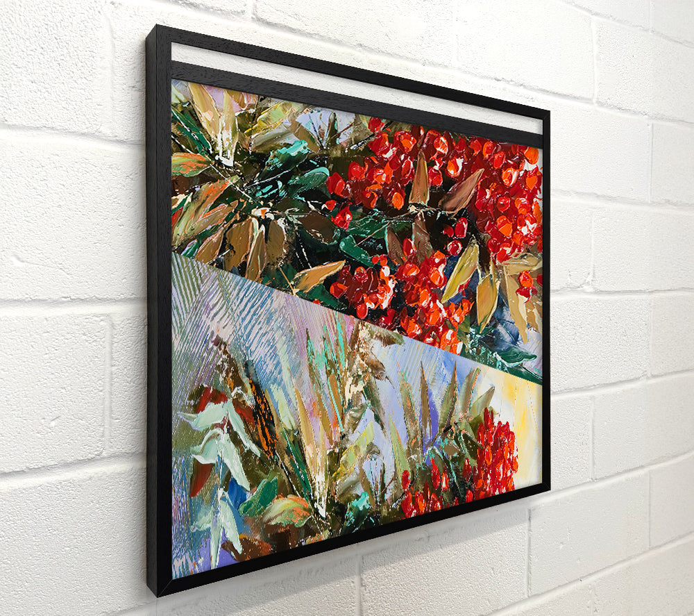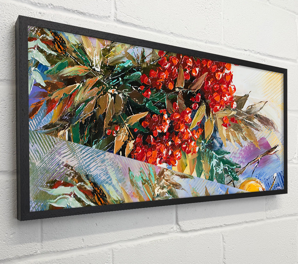 Quadratische Leinwand „Vase Of Fruit“, gedruckt auf beschichteter Polyester-Leinwand. Auf einem 44 mm großen Kastenrahmen montiert, fertig zum Aufhängen.