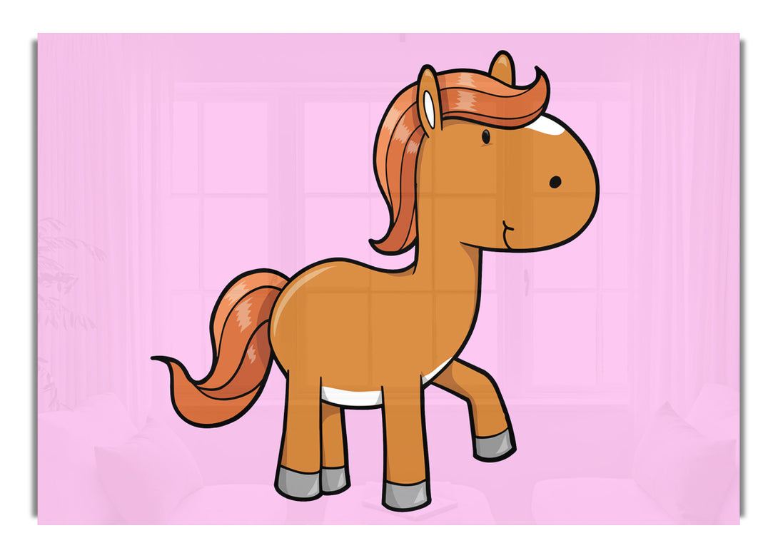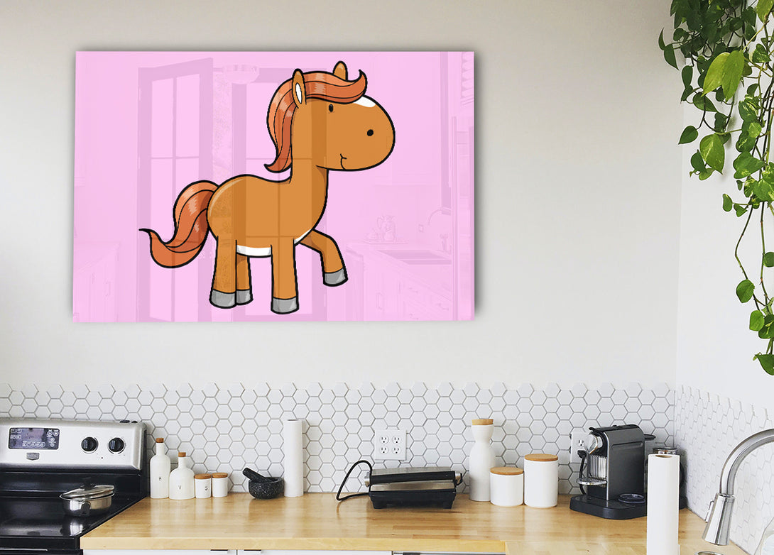 Acryldruck „Walking Pony Horse Pink“, UV-gedruckt auf 5 mm dickes Acrylglas. Wird mit allem geliefert, was Sie zum Aufhängen an die Wand brauchen.