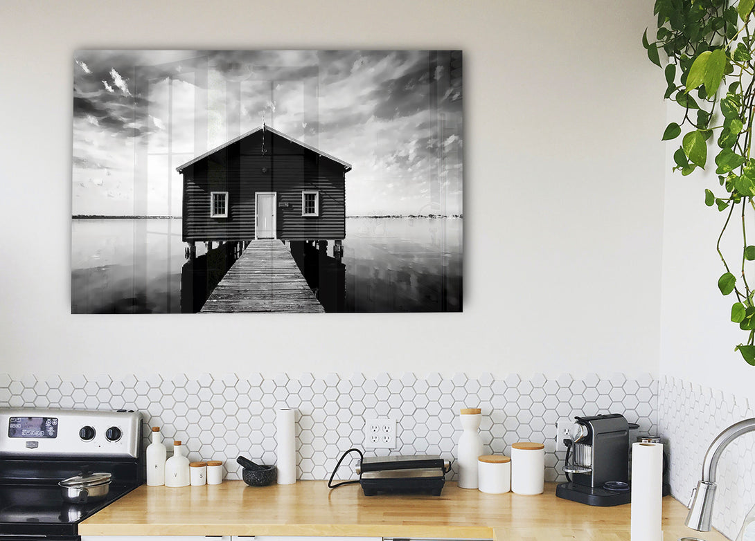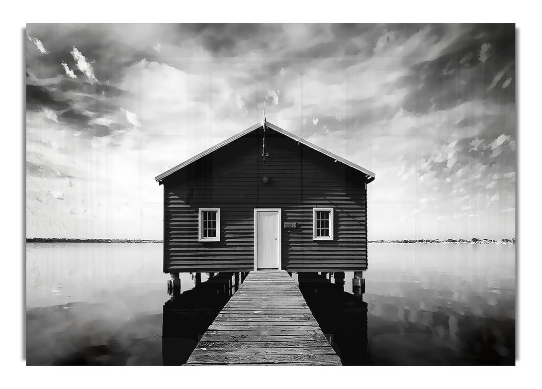 S/W-Acryldruck „Water House“, UV-gedruckt auf 5 mm dickes Acrylglas. Wird mit allem geliefert, was Sie zum Aufhängen an die Wand brauchen.