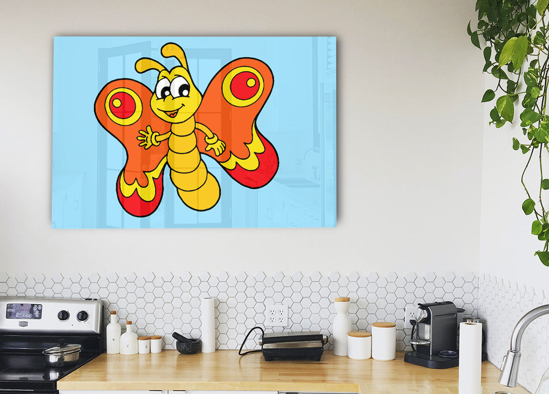 Acryldruck „Winkender Schmetterling in Babyblau“, UV-gedruckt auf 5 mm dickes Acrylglas. Wird mit allem geliefert, was Sie zum Aufhängen an die Wand brauchen.