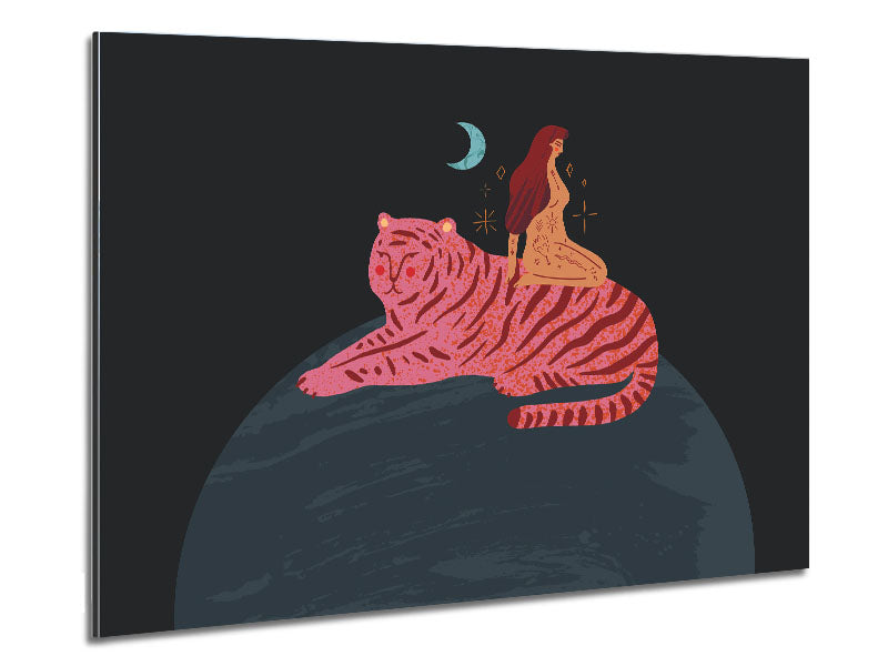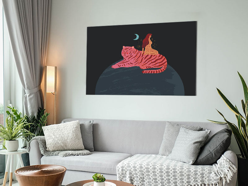 Frau und Tigerplanet. Gedruckt auf gebürstetem Aluminium-Dibond. Eine moderne Art, Kunst zu präsentieren und leicht zu pflegen.