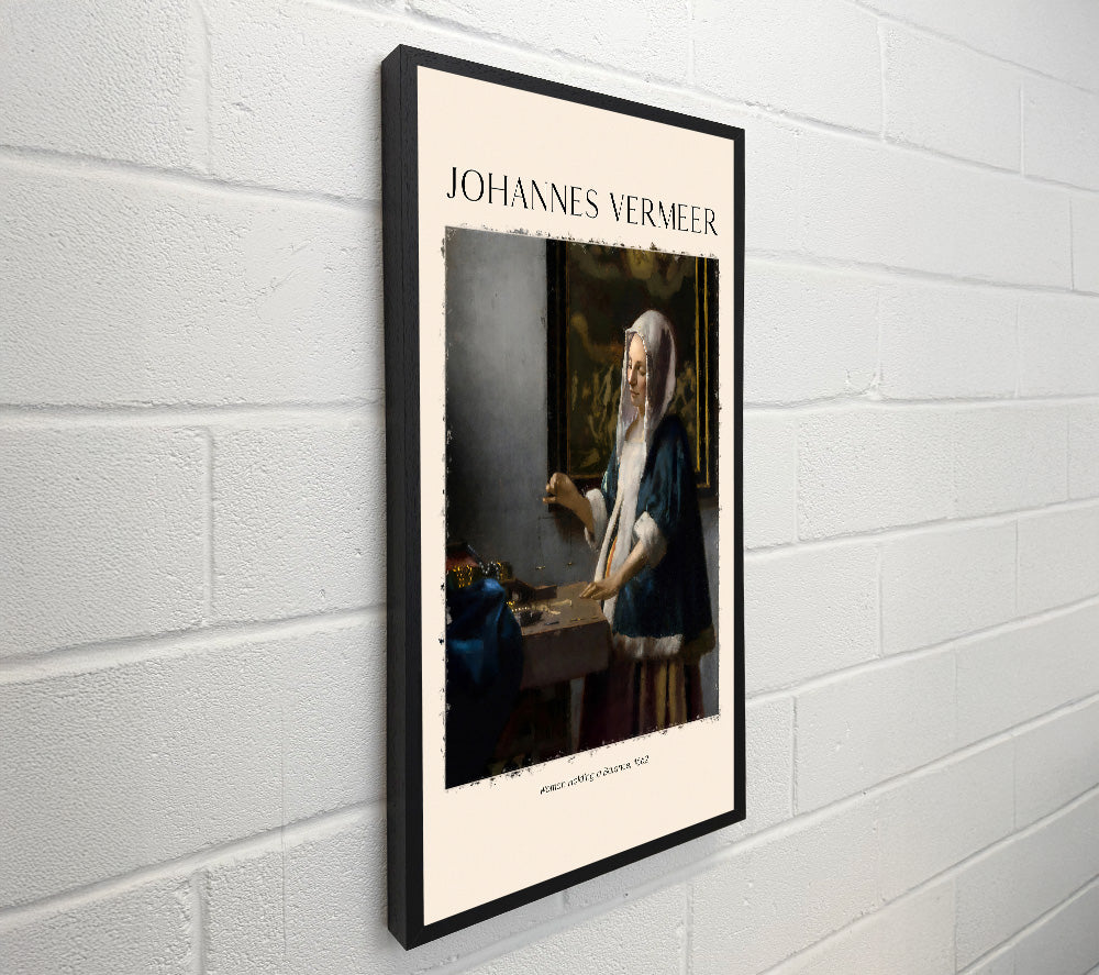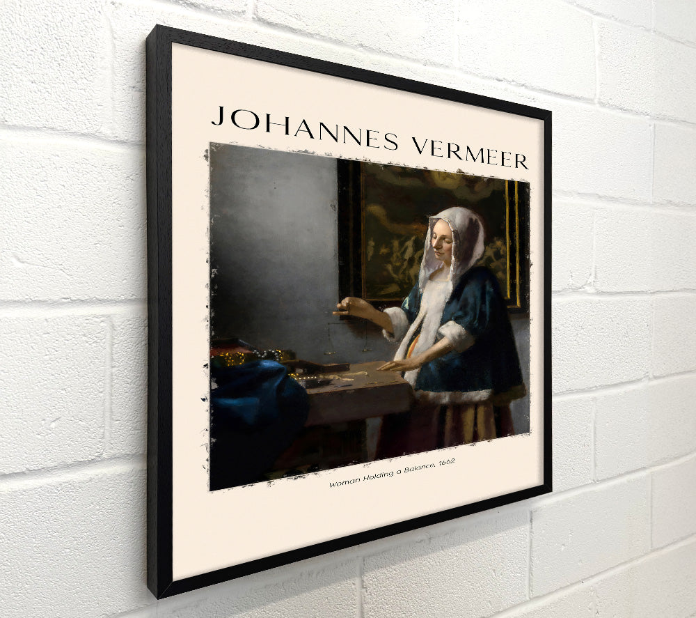 Frau mit Waage, 1662 von Johannes Vermeer, quadratische Leinwand, gedruckt auf beschichteter Polyester-Leinwand. Auf einem 44 mm breiten Kastenrahmen montiert, fertig zum Aufhängen.