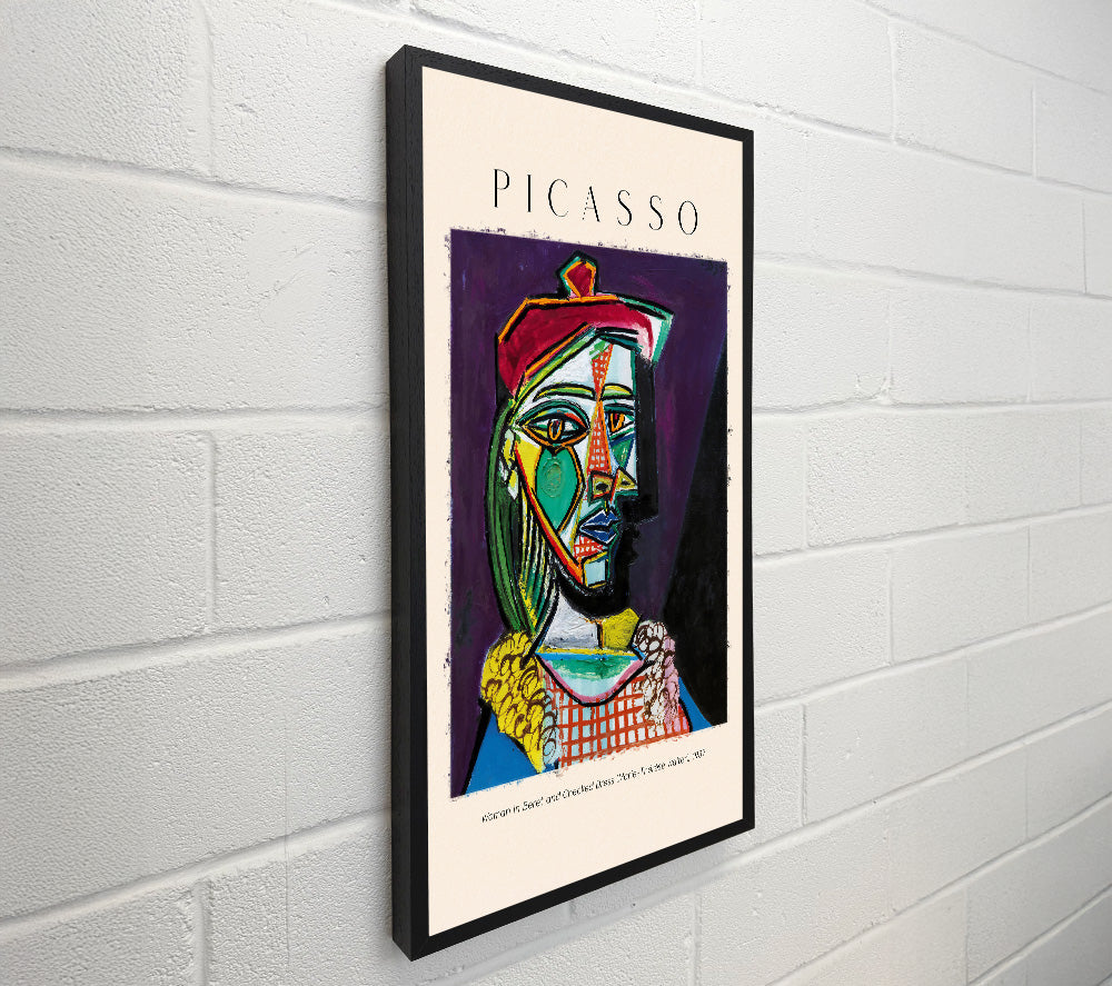 Frau mit Baskenmütze und kariertem Kleid, 1937, von Picasso. Quadratische Leinwand, gedruckt auf beschichteter Polyester-Leinwand. Auf einem 44 mm breiten Kastenrahmen montiert, fertig zum Aufhängen.