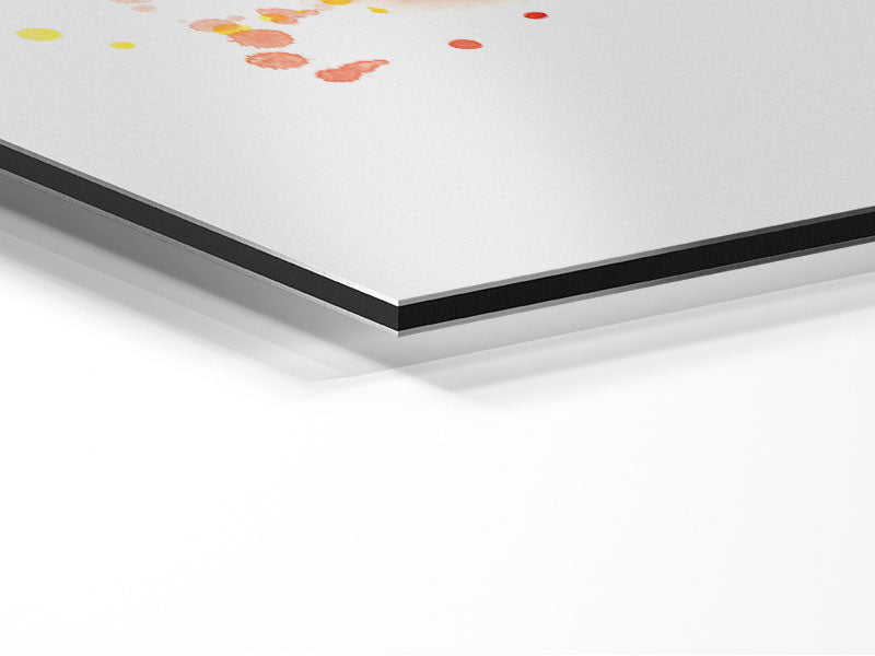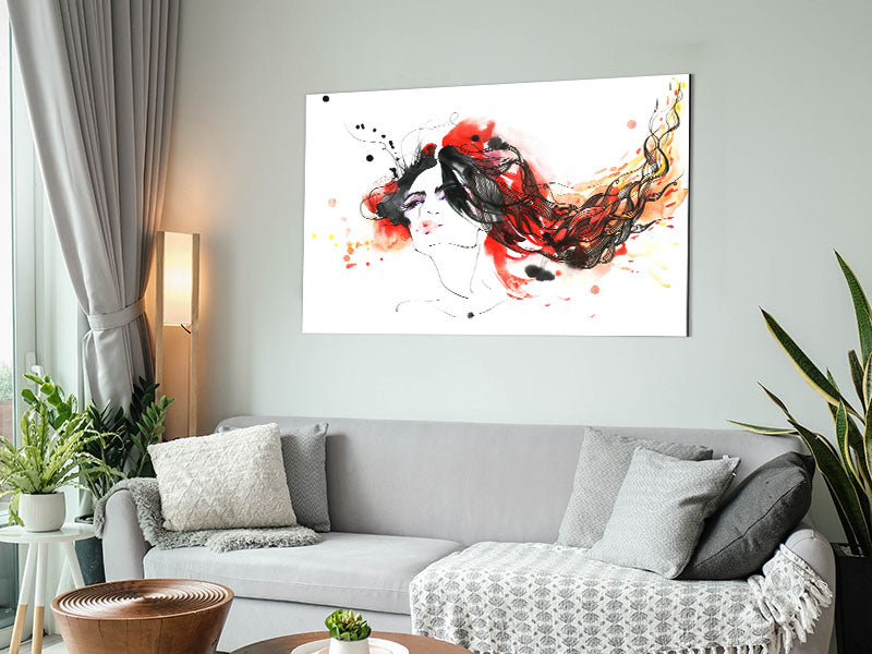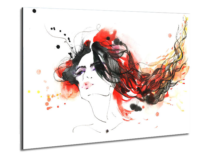 Frau in Tinte und Rot. Gedruckt auf gebürstetem Aluminium-Dibond. Eine moderne Art, Kunst zu präsentieren und leicht zu pflegen.