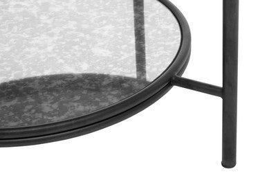 This coffee table has a round table top made from antique mirrored glass, with a matching lower shelf for open storage. The two tier design in a rustic effect forms a bold contrast with the minimal metal frame in black and silver finish.
