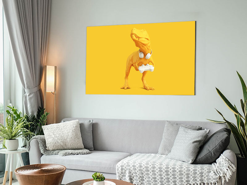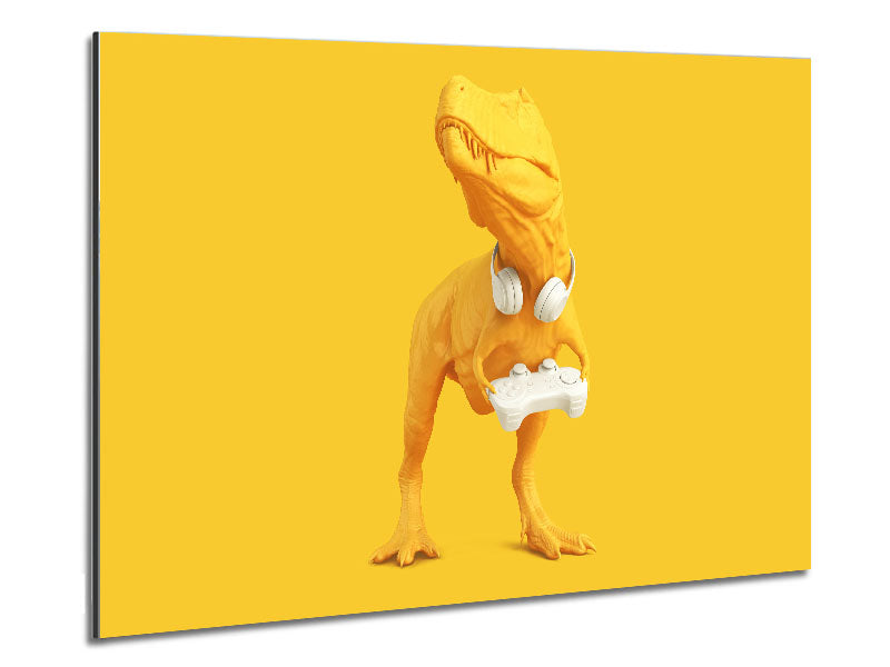 Gelber Dinosaurier-Gamer. Gedruckt auf gebürstetem Aluminium-Dibond. Eine moderne Art, Kunst zu präsentieren und leicht zu pflegen.
