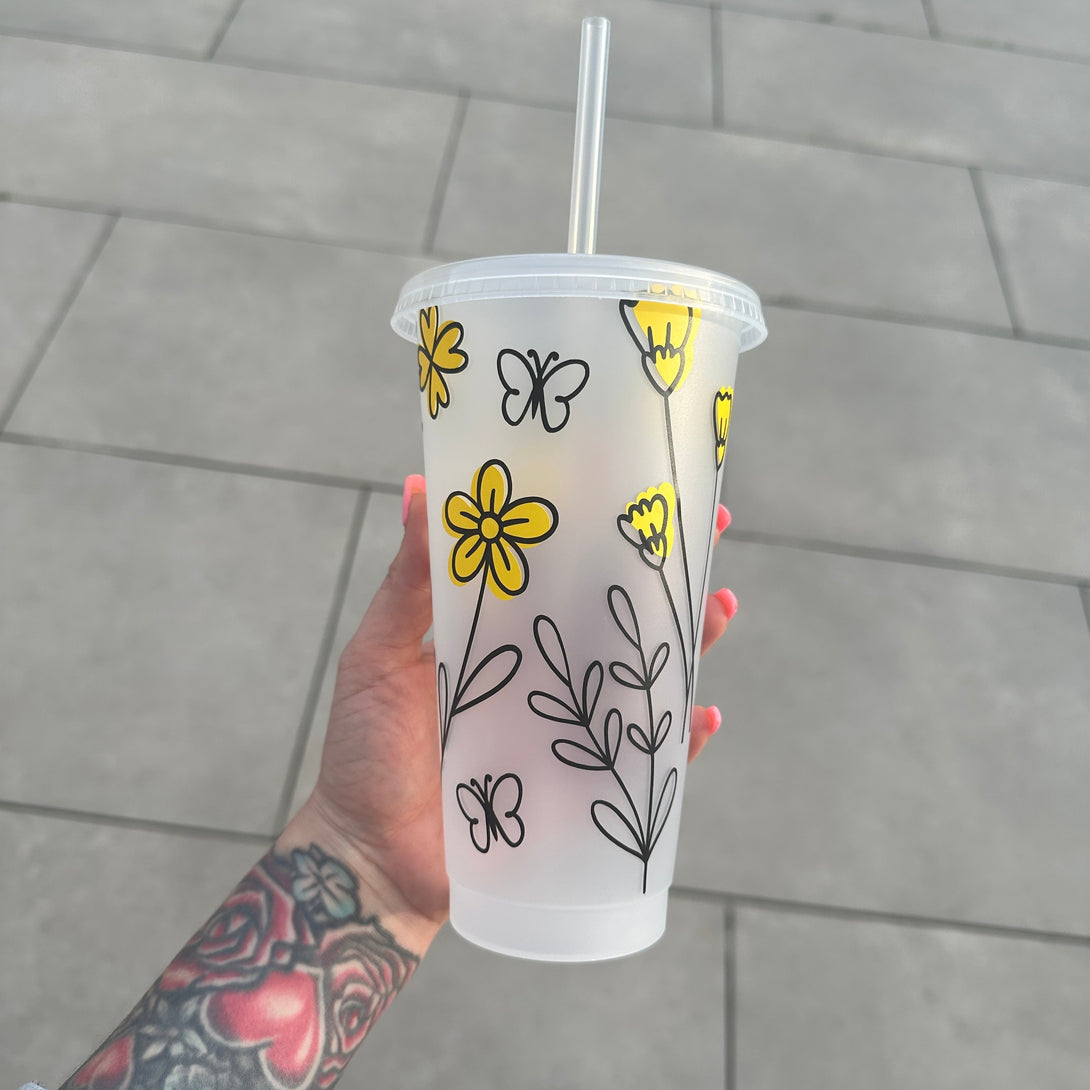 Yellow Floral Line Work Tumbler Venti Cold Cup 24oz - With Straw