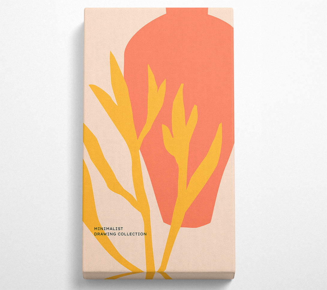 Breite Leinwand „Gelbe Pflanze und Vase“, gedruckt auf beschichteter Polyester-Leinwand. Auf einem 44 mm großen Kastenrahmen montiert, fertig zum Aufhängen.
