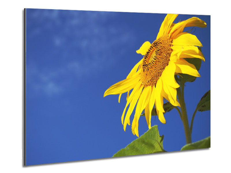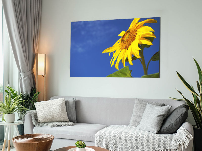 Gelbe Sonnenblume, die über dem Rest ragt. Gedruckt auf gebürstetem Aluminium-Dibond. Eine moderne Art, Kunst zu präsentieren und leicht zu pflegen.