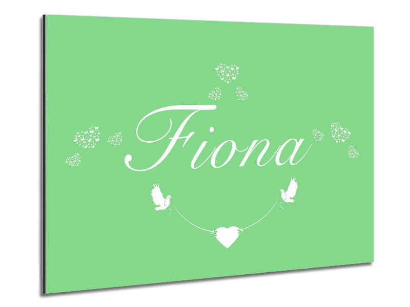 Ihr Name in Herzen, grün, gedruckt auf gebürstetem Aluminium-Dibond. Eine moderne Art, Kunst zu präsentieren und leicht zu pflegen.