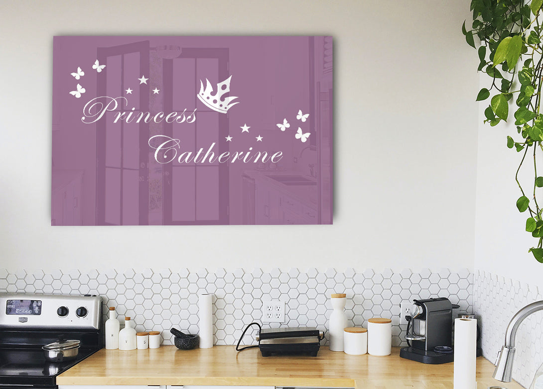 Acryldruck „Your Own Name Princess 2 Dusty Pink“, UV-gedruckt auf 5 mm dickes Acrylglas. Wird mit allem geliefert, was Sie zum Aufhängen an die Wand brauchen.