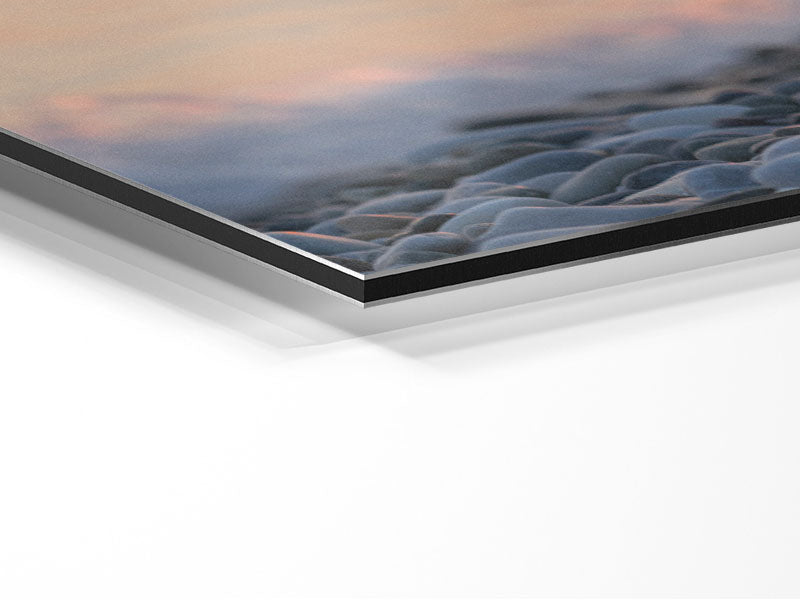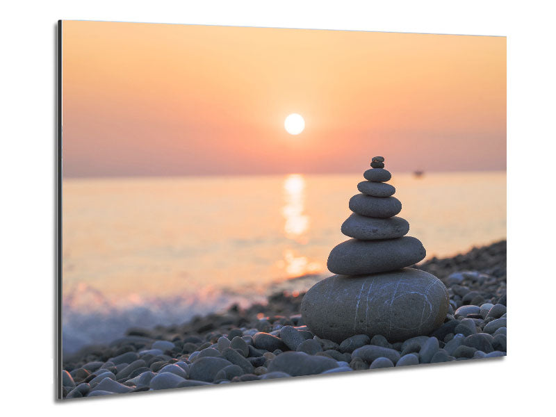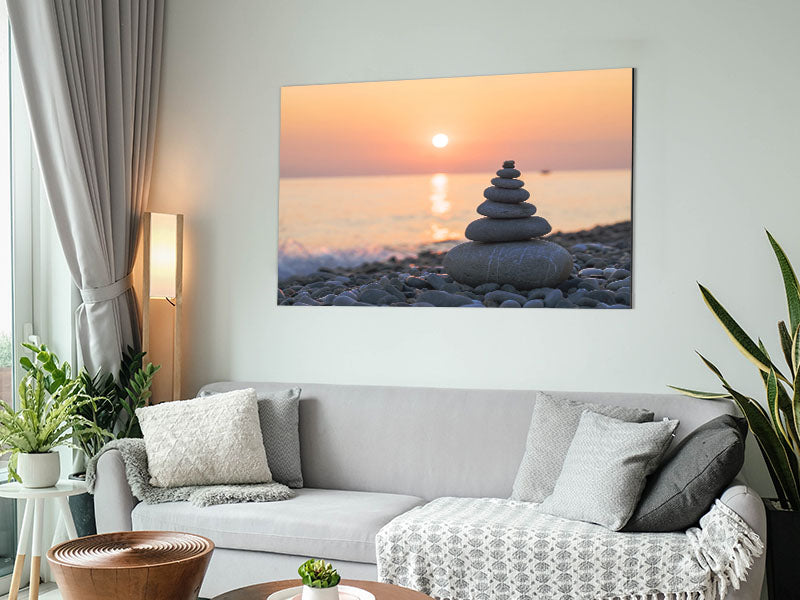 Zen-Steine bei Sonnenuntergang am Strand. Gedruckt auf gebürstetem Aluminium-Dibond. Eine moderne Art, Kunst zu präsentieren und leicht zu pflegen.