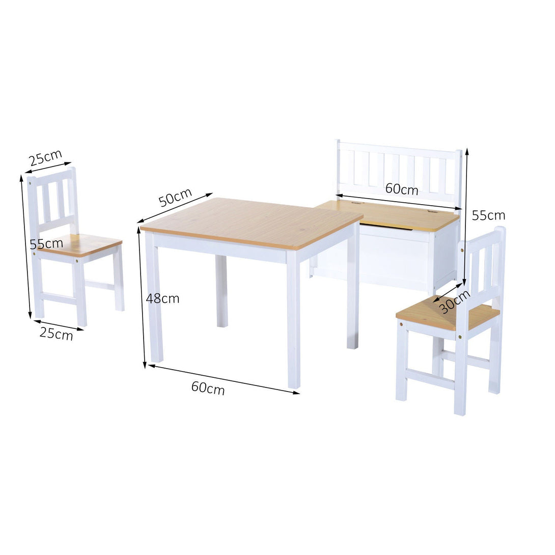 - Includes 4-piece kids side set, a table, 2 chairs and a storage bench