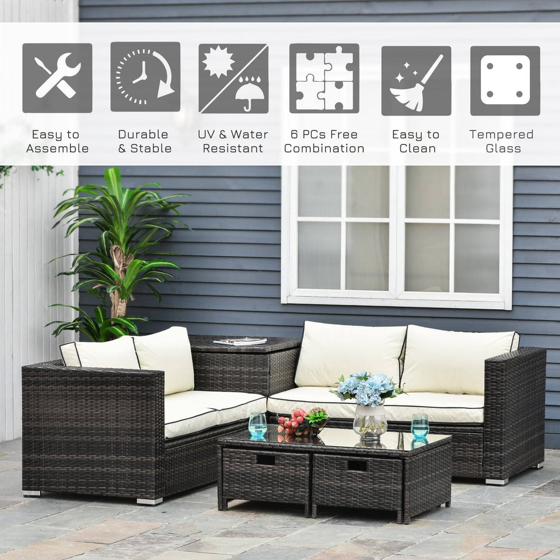 Generous in size and stylish in design, let this outdoor corner sofa from Outsunny take the lead for your outdoor leisure times this season. The small garden furniture consists of four pieces two two-seater sofas, a tall storage corner table and an oblong coffee table with drawers, giving you plenty of room to relax all day by yourself or with others. Discreet storage is located both on the tall corner table of the garden furniture sets, with two drawers in the oblong coffee table.