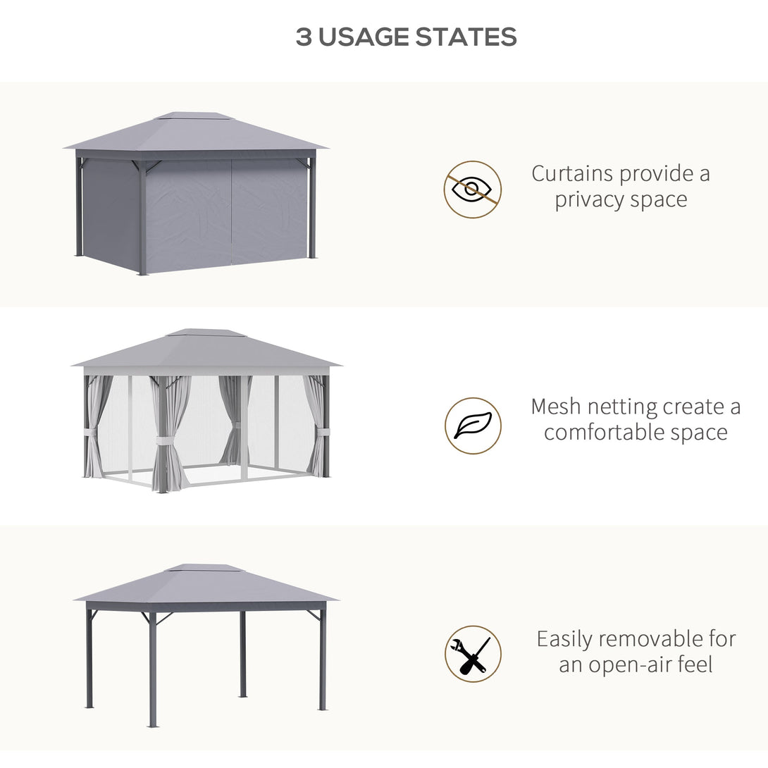 This 4 x 3(m) spacious hot tub gazebo with sides from Outsunny is a great way to upgrade your outdoor space with elegance. You can entertain your friends and family members to hold the party or just relax and enjoy the conversation. It features the rust-resistant aluminium frame with the UV protection polyester canopy and 2 layer sidewalls for strength and full shade. You deserve some comfort in the sun: create your own personal oasis with our grey gazebo.